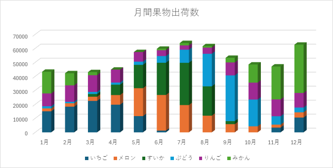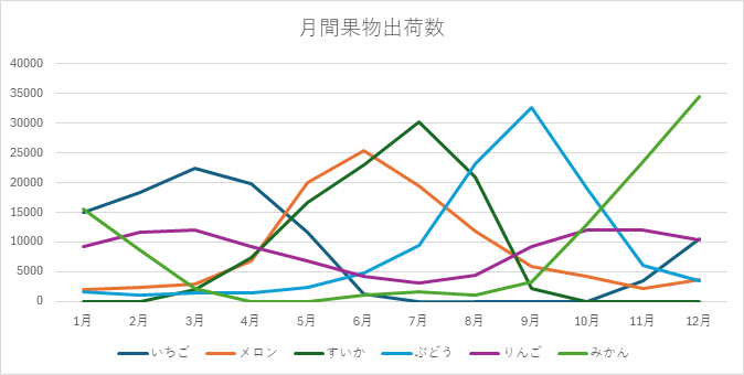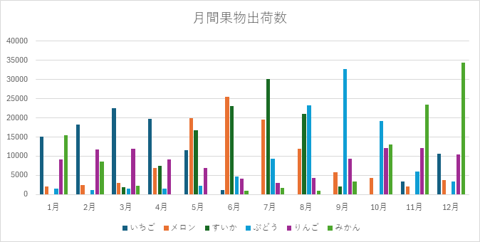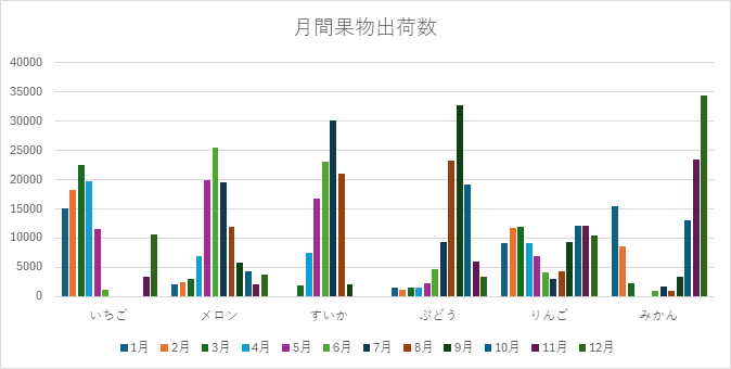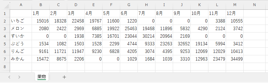 例:果物の出荷量を月ごとにまとめた表(果物出荷数.xlsx – 果物)
