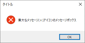 MsgBox "重大なメッセージ(x)アイコンのメッセージボックス", vbCritical, "タイトル"