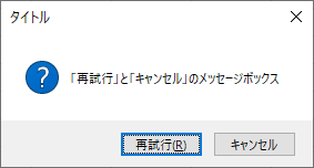result = MsgBox("「再試行」と「キャンセル」のメッセージボックス", vbQuestion + vbRetryCancel, "タイトル")