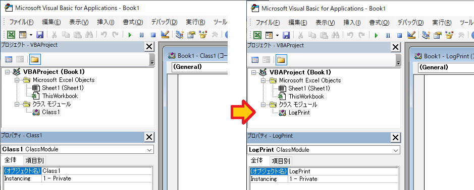 以下のコードをクラスモジュールの「LogPrint」のエディタにコピーしてください。